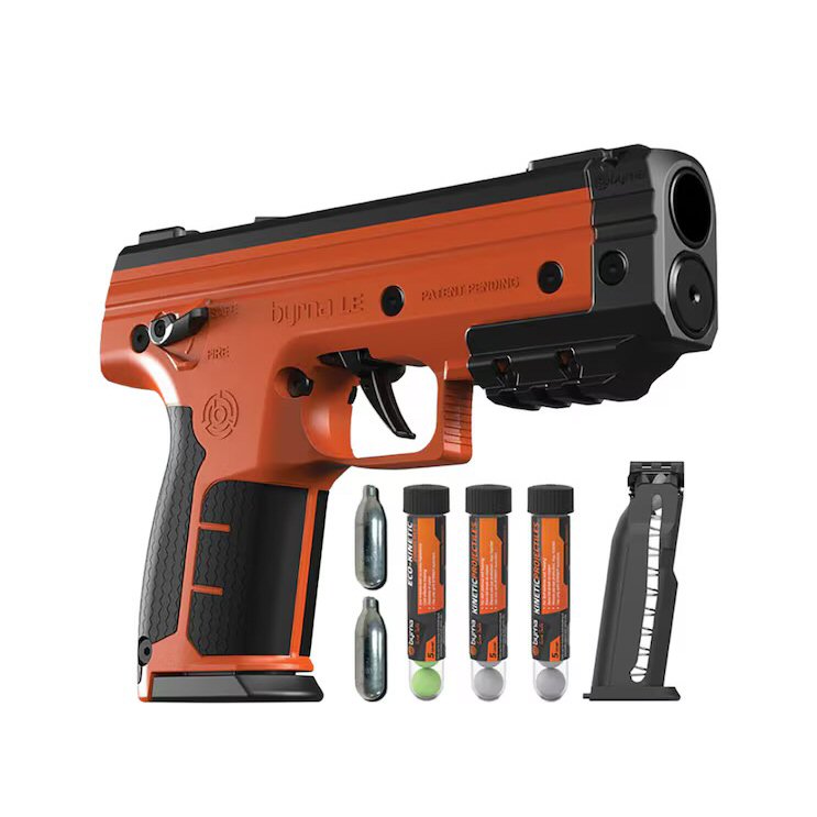 The Byrna LE, Byrna's most powerful handheld launcher, is now available to the public! The Byrna LE features a completely redesigned trigger interface and valve assembly to fire .68 caliber rounds at speed of up to 340 feet per second. The trigger design on the Byrna LE allows for a much smoother and lighter trigger pull, providing a better experience for the shooter. The LE launcher is able to launch Byrna kinetic projectiles at velocities up to 340 feet per second with an effective range of 80 feet.