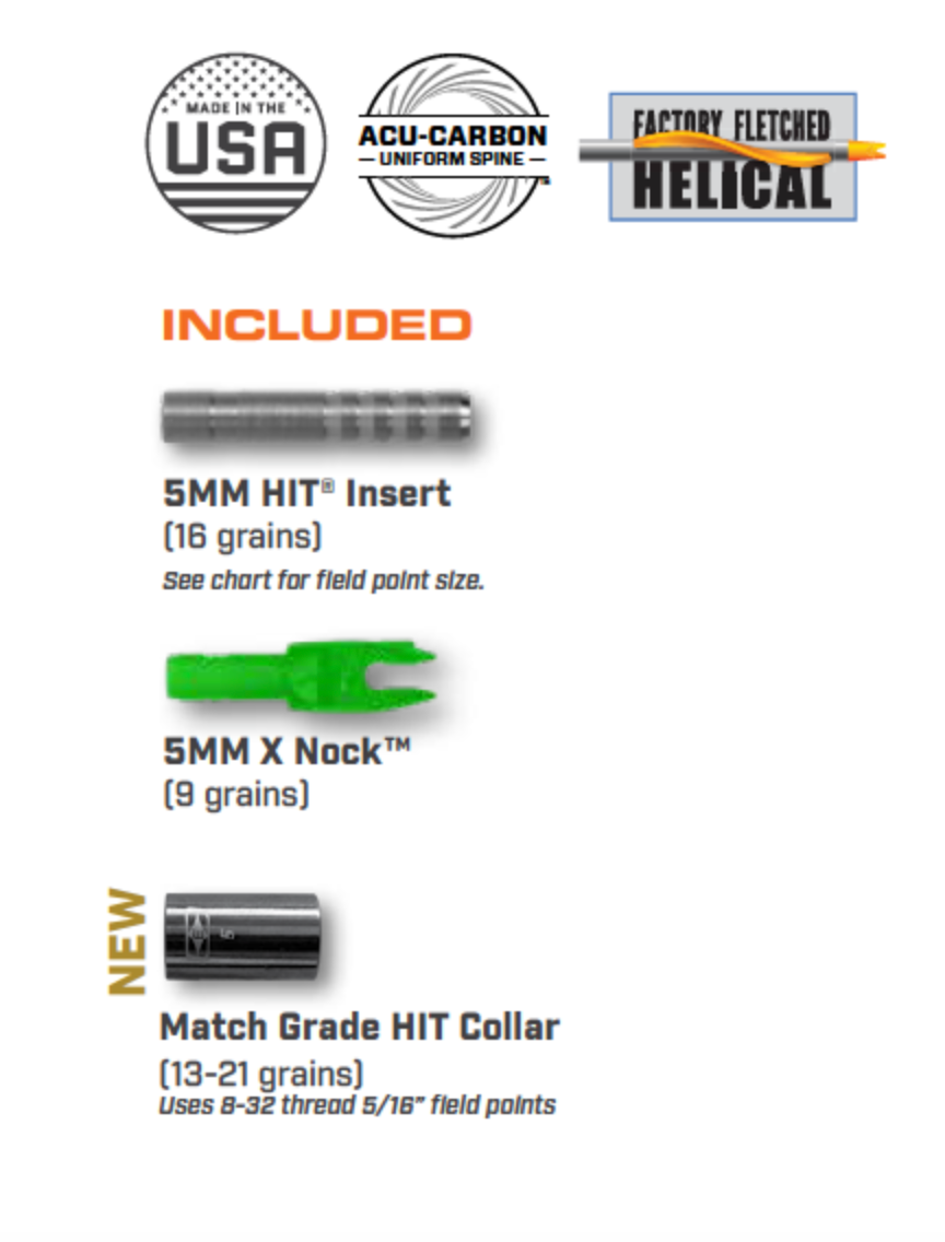 - Components Included: 5 mm HIT 8-32 Inserts (16 grains), 5mm X Nocks (9 grains), and Match Grade HIT Collar (13 - 21 grains)