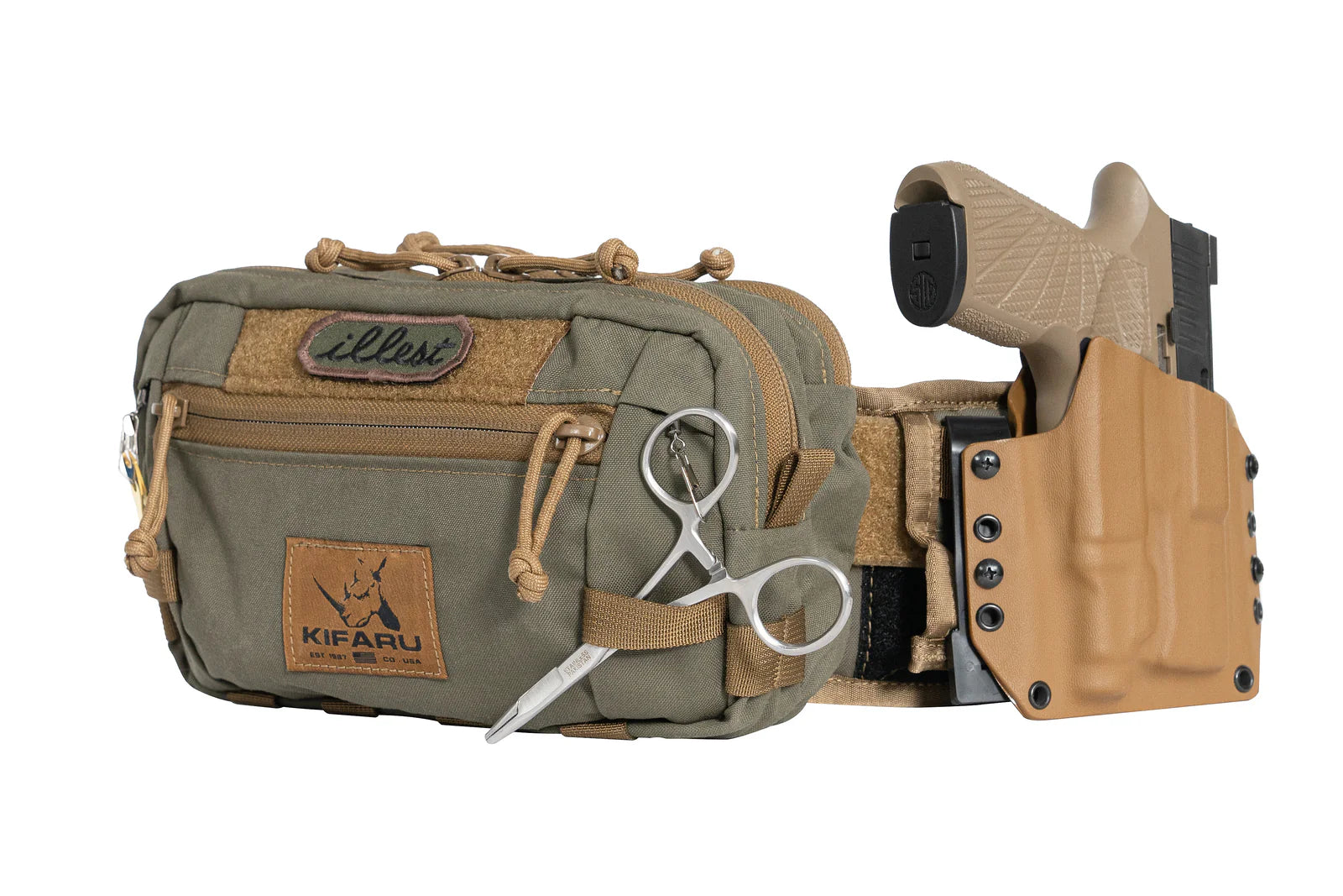 Made to go with our Quiver system, the Rogan adds capacity to your range setup or can be used on its own as a small fishing rig or everyday bag. The front pocket has a key hook and two tool retractor exits so you can set up quick access items like hemostats for fishing (clip on fishing retractors work great) or arrow pulling tools for the 3d course (heavier duty retractors recommended). There are two zippers on this pocket so you can stow the tools when not needed. The main pocket has a zippered mesh pocket sewn on an open topped sleeve and two stretchy pockets sewn to the back. The stretchy pockets are sized to fit most small fly boxes or range finders. The front sleeve pocket and two stretchy pockets have dummy cord loops sewn over top. The back pocket is narrower in profile and holds most sub compact and compact pistols. There is a tab at the bottom to secure Zacchaeus holsters so you can keep your trigger covered and uncovered when you want it. On the bottom of the pocket you will find mounting points for bear spray holsters or a place to lace bungie cord to wrangle a rain layer. Each Rogan pocket can come with your choice of a quiver belt of your size, or with no belt and will also work with any 2” velcro loop faced belts. On the back there is a large passthrough backed with spacer mesh that will work with our Rogan Belt system. This will add rigidity and 2 Molle strips with 4 channels on either side of the pack.